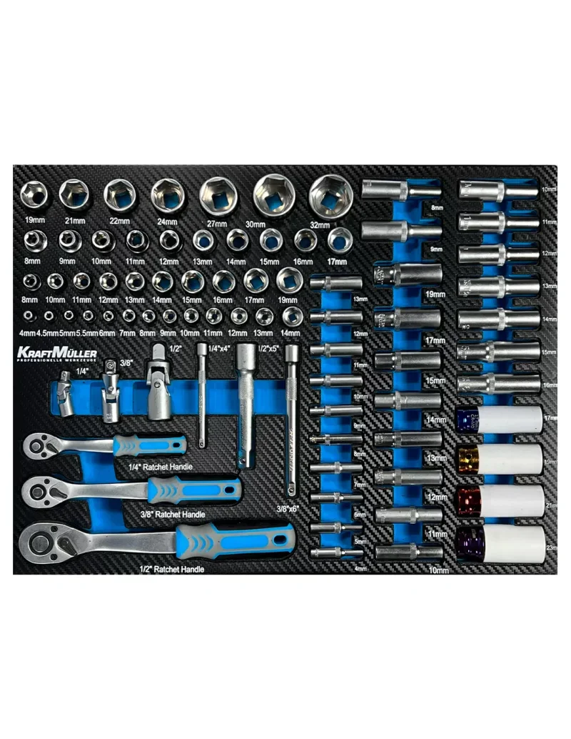 - 1er tiroir 80 outils : lot de 3 cliquets ¼ 3/8 ½ avec douilles courtes et douilles longues, rallonges et cardans + 4 douilles choc bague téflon