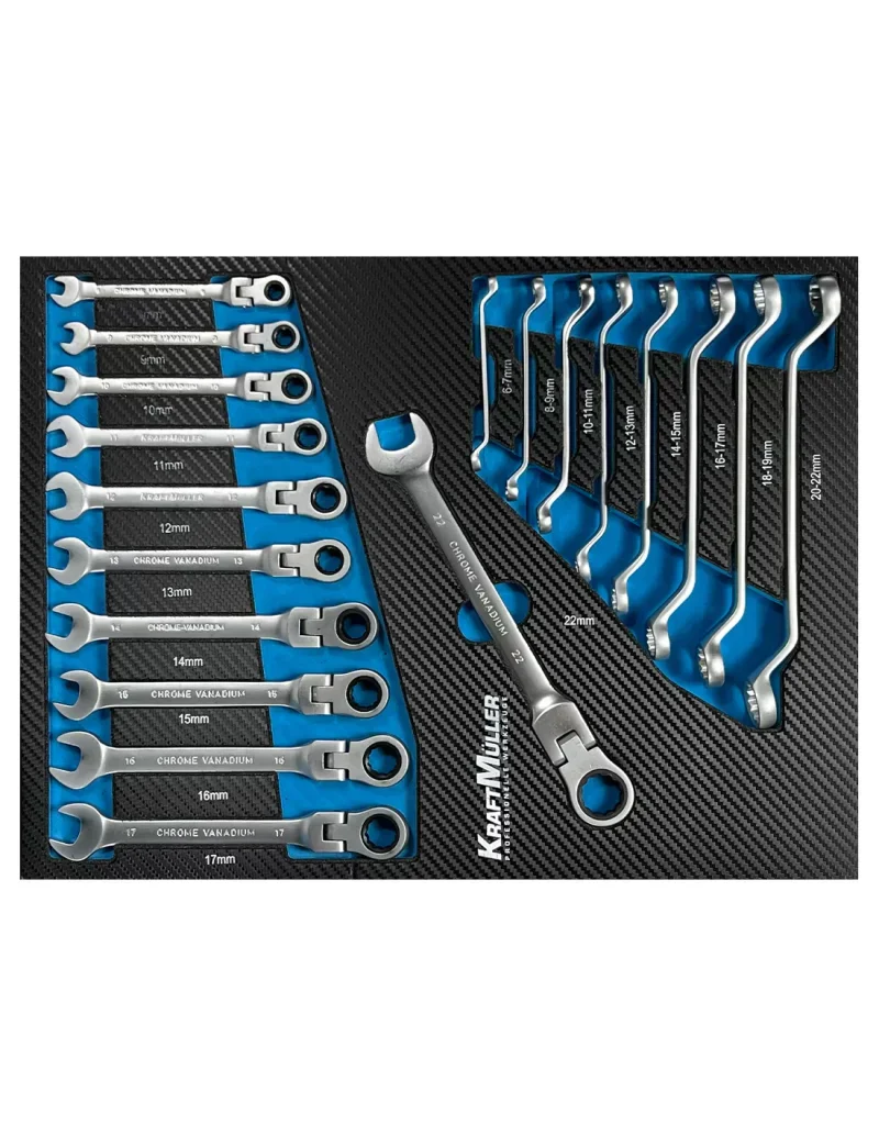 - 4ème tiroir 20 outils : assortiment de clés plates de 8 à 17 + 22mm à œil cliquet + clés polygonales de 6 à 22mm